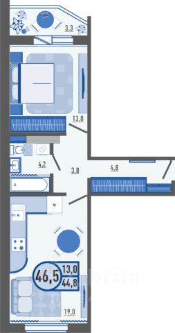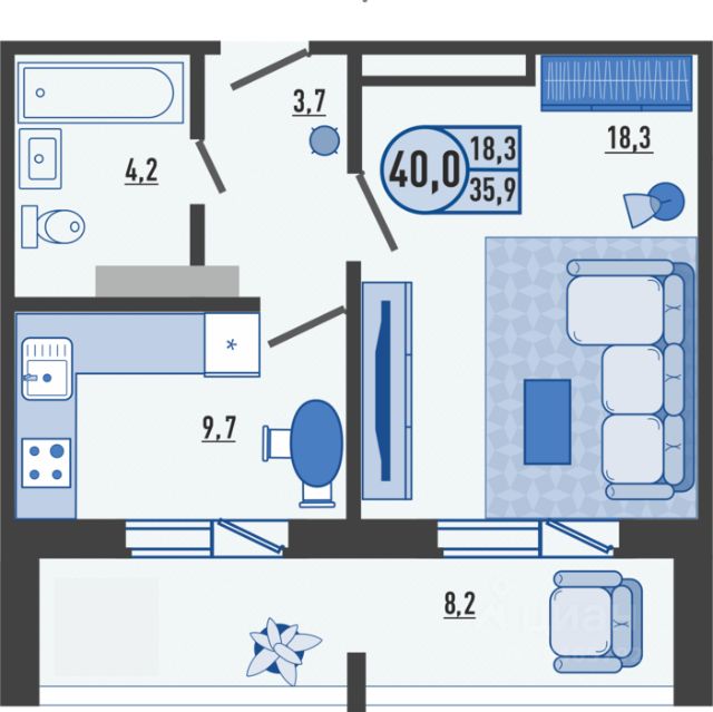 Общая площадь квартиры — 34,9 кв. м (без учёта балкона 3,4 кв. м).