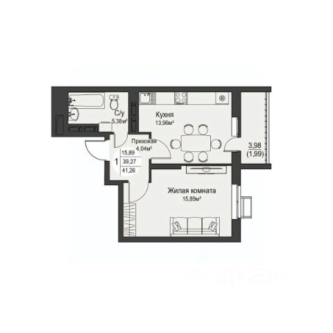 Общая площадь 39, 6 кв.м, жилая 12,5 кв.м, кухня 10,2 кв.м, санузел 4 кв.м, балкон 6,6 кв.м.