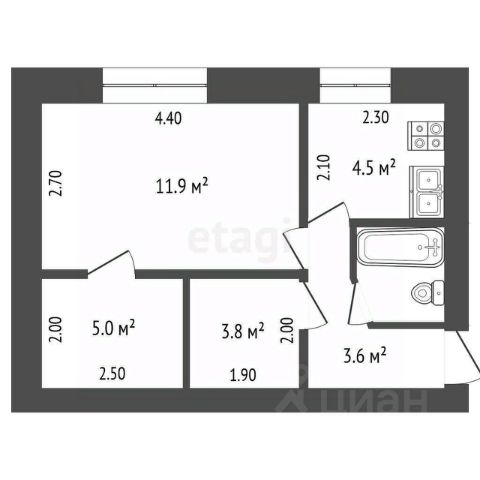 Общая площадь - 37,8 кв.м, жилая - 16 кв.м, кухня- 9,2 кв.м; потолки - 2,75 м; ванная - 3,0 кв.м, туалет - 1,2 кв.м.