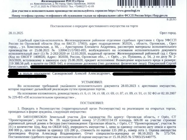 Данные получены с сайта ГИС Торги. • Здание, назначение: нежилое, наименование: гараж, кадастровый номер 57:27:0010215:190, площадь 15,7 кв.м., местоположение: Российская Федерация, Орловская обл., г. Мценск, ГСК Радуга, гараж 20. • Земельный участок, категория земель: земли населенных пунктов, виды разрешенного использования: строительство гаража, кадастровый номер 57:27:0010215:28, площадь 18,3 кв.м., местоположение: Орловская обл, г Мценск, ГСК "Радуга". Особые отметки: Граница земельного участка не установлена в соответствии с требованиями земельного законодательства. СМ.ИЗВЕЩЕНИЕ. Принадлежит должнику на праве пожизненного наследуемого владения. Взыскатель: Ботвинова С.В. Начальная цена: 121 300 (Сто двадцать одна тысяча триста) руб. 00 коп., без НДС, сумма задатка: 50 000 (Пятьдесят тысяч) руб. 00 коп. Шаг аукциона 1%: 1 213 (Одна тысяча двести тринадцать) руб. 00 коп. Продается гараж в Мценске.
