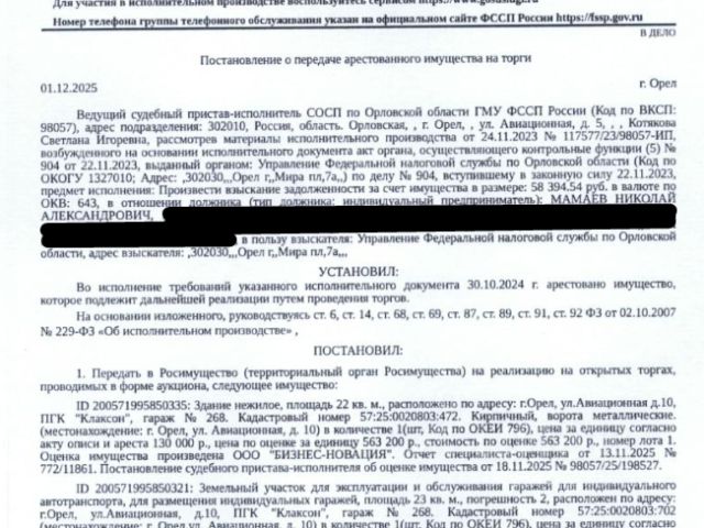Данные получены с сайта ГИС Торги. • Здание, назначение: нежилое, наименование: гараж, кадастровый номер 57:25:0020803:472, площадь 22 кв.м., местоположение: Орловская область, г Орёл, ул Авиационная, д 10, ПГК "Клаксон", гараж 268. • Земельный участок, категория земель: земли населенных пунктов, виды разрешенного использования: для эксплуатации и обслуживания гаражей для индивидуального автотранспорта, кадастровый номер 57:25:0020803:702, площадь 23 +/- 2 кв.м., местоположение: Орловская обл, г Орел, ул Авиационная, 10, ПГК "Клаксон", гараж 268. Доп.информация - см. извещение.Взыскатель: УФНС по Орловской области. Начальная цена 615 400 (Шестьсот пятнадцать тысяч четыреста) руб. 00 коп., без НДС, сумма задатка 300 000 (Триста тысяч) руб. 00 коп. Шаг аукциона 1%: 6 154 (Шесть тысяч сто пятьдесят четыре) руб. 00 коп. Продается гараж на улице Авиационная в городе Орел.