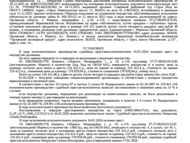Данные получены с сайта ГИС Торги. Помещение, назначение: жилое, наименование: комната, площадь 13,4 кв.м., кадастровый номер 57:27:0020518:3245, местоположение: Российская Федерация, Орловская область, г Мценск, мкр 1-й, д 10, к 119. Согласно ответу МО МВД РФ "Мценский" от 18.02.2026 по данному адресу с 23.03.2021 по 23.03.2026 зарегистрировано по месту пребывания 2 человека. Согласно справке НО "РФКР" задолженность по взносам на капитальный ремонт по состоянию на 18.02.2026 составляет 7 522,87 руб. Залогодержатель: КПК "Орловский жилищный кредит". Начальная цена: 178 859 (Сто семьдесят восемь тысяч восемьсот пятьдесят девять) руб. 04 коп., без НДС, сумма задатка: 5 000 (Пять тысяч) руб. 00 коп. Шаг аукциона 1%: 1 788 (Одна тысяча семьсот восемьдесят восемь) руб. 59 коп.
