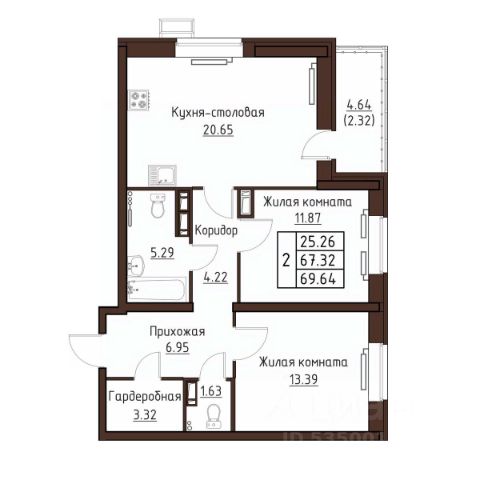 Продаётся 2-комнатная квартира в сданном доме (дом 21к1), срок сдачи: I-кв. 2025, общей площадью 68.64 кв.м., на 1 этаже. Новый жилой комплекс "Тринити" от застройщика "СЗ Инжилком" расположен по адресу Орёл, улица Левый Берег реки Оки, 21к1.