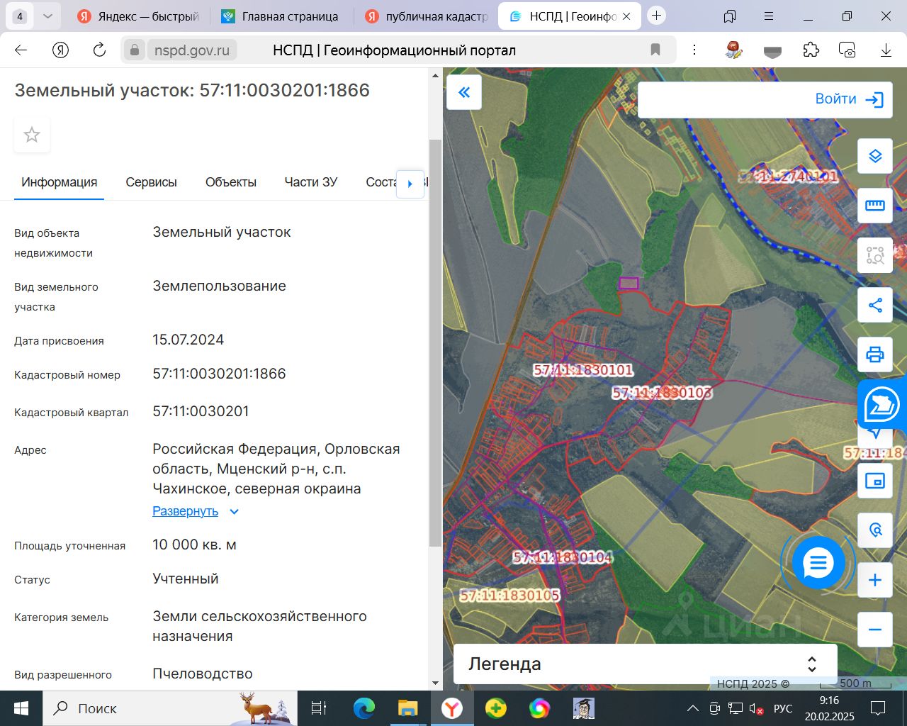 Земельный участок с кадастровым номером: 57:11:0030201:1866, из категории земель: земли сельскохозяйственного назначения, площадью 10000 кв. м., местоположение: Российская Федерация, Орловская область, Мценский район, Чахинское сельское поселение, северная окраина с. Подбелевец, разрешенное использование: пчеловодство.