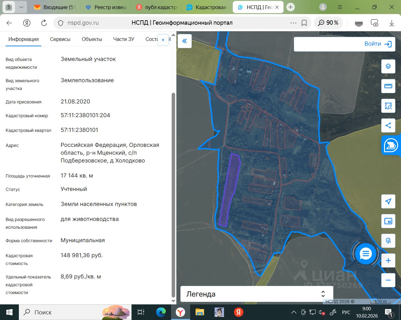 Земельный участок из категории земель населенных пунктов, кадастровый номер: 57:11:2380101:204, площадью 17144 кв. м., местоположение: Российская Федерация, Орловская область, Мценский район, Подберезовское сельское поселение, д. Холодково, разрешенное использование: для животноводства.