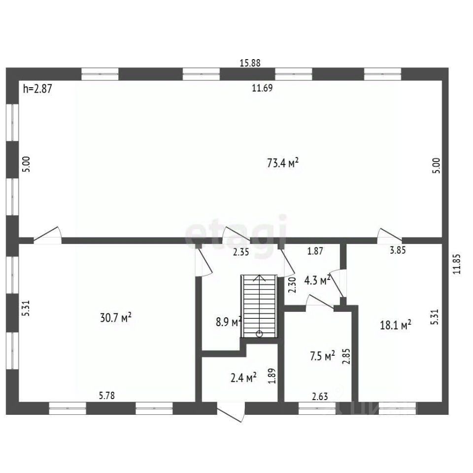 30,7 / 73,4 м2. Выбирайте любую площадь (500руб/м²) или обе сразу т.к. возможна свободная планировка