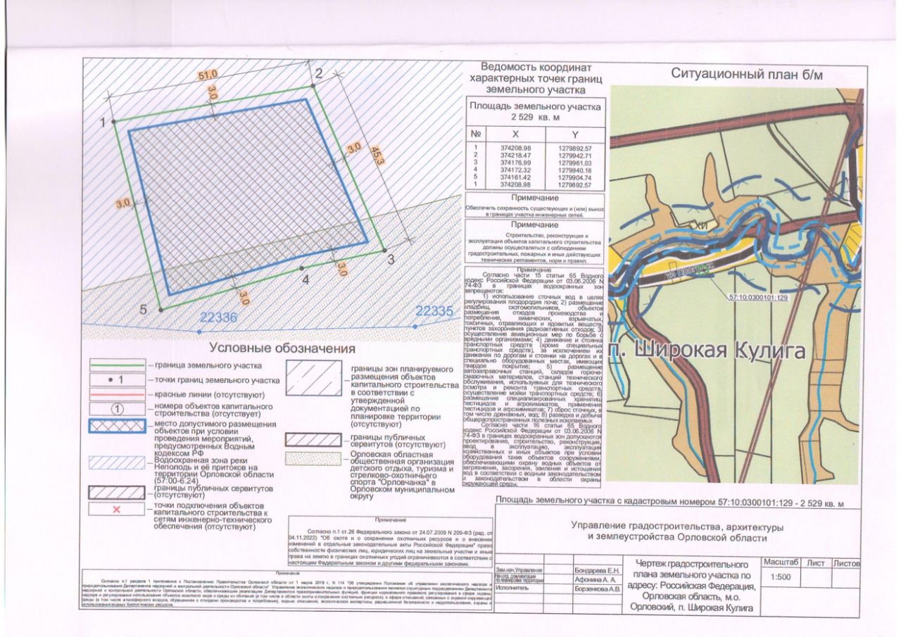 Земельный участок из земель населенных пунктов, общей площадью 2529 кв. м., с кадастровым номером 57:10:0300101:129, местоположением: Российская Федерация, Орловская область, м. о. Орловский, п. Широкая Кулига, с разрешенным использованием для ведения личного подсобного хозяйства (приусадебный земельный участок). Ограничения прав на земельный участок, предусмотренные статьями 56, 56.1 Земельного кодекса Российской Федерации, Правилами землепользования и застройки Орловского муниципального округа Орловской области, утвержденными решением Орловского окружного Совета народных депутатов от 29 декабря 2022 года 200-МПА "Об утверждении Правил землепользования и застройки Орловского муниципального округа Орловской области" водоохранная зона реки Неполодь и её притоков на территории Орловской области реестровый номер границы 57:10-6.24.