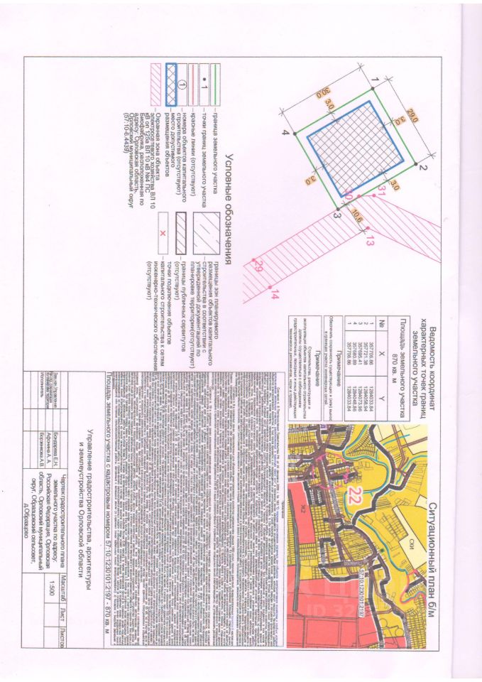 Земельный участок из земель населенных пунктов, общей площадью 870 кв. м., с кадастровым номером 57:10:1230101:2197, местоположением: Российская Федерация, Орловская область, Орловский муниципальный округ, Образцовский сельсовет, д. Образцово, с разрешенным использованием для индивидуального жилищного строительства. Ограничения прав на земельный участок, предусмотренные статьями 56, 56.1 Земельного кодекса Российской Федерации, Правилами землепользования и застройки Орловского муниципального округа Орловской области, утвержденными решением Орловского окружного Совета народных депутатов от 29 декабря 2022 года 200-МПА "Об утверждении Правил землепользования и застройки Орловского муниципального округа Орловской области" охранная зона объекта электросетевого хозяйства ВЛ 10 кВ оп 125а ВЛ 10 кВ 4 ПС Биофабрика, расположенная по адресу: Орловская область, Орловский муниципальный округ реестровый номер границы 57:10-6.4439