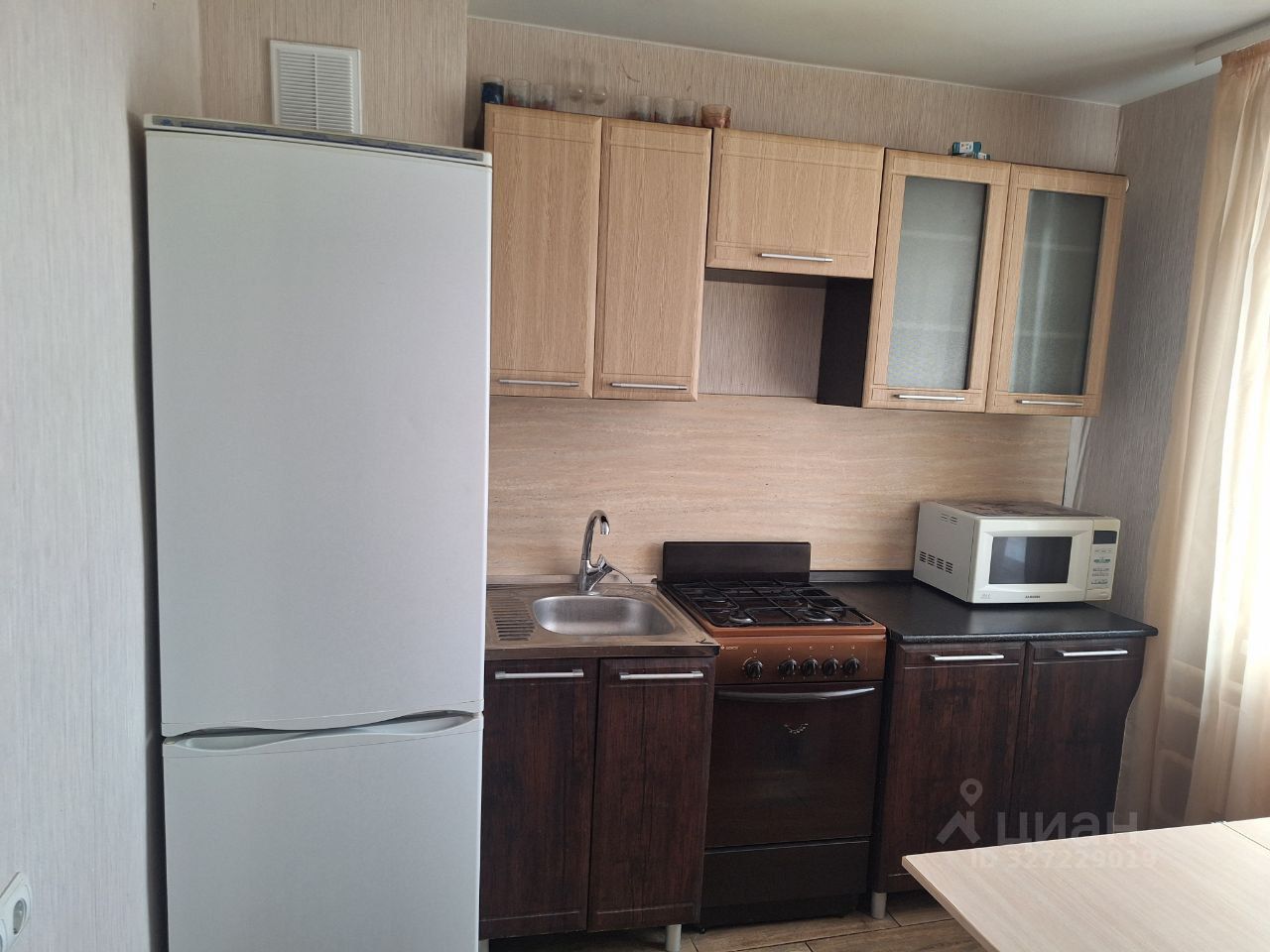 На кухне есть необходимая мебель и техника, включая холодильник и стиральную машину. Ванная комната оборудована душевой кабиной, что особенно удобно для быстрого утреннего душа.