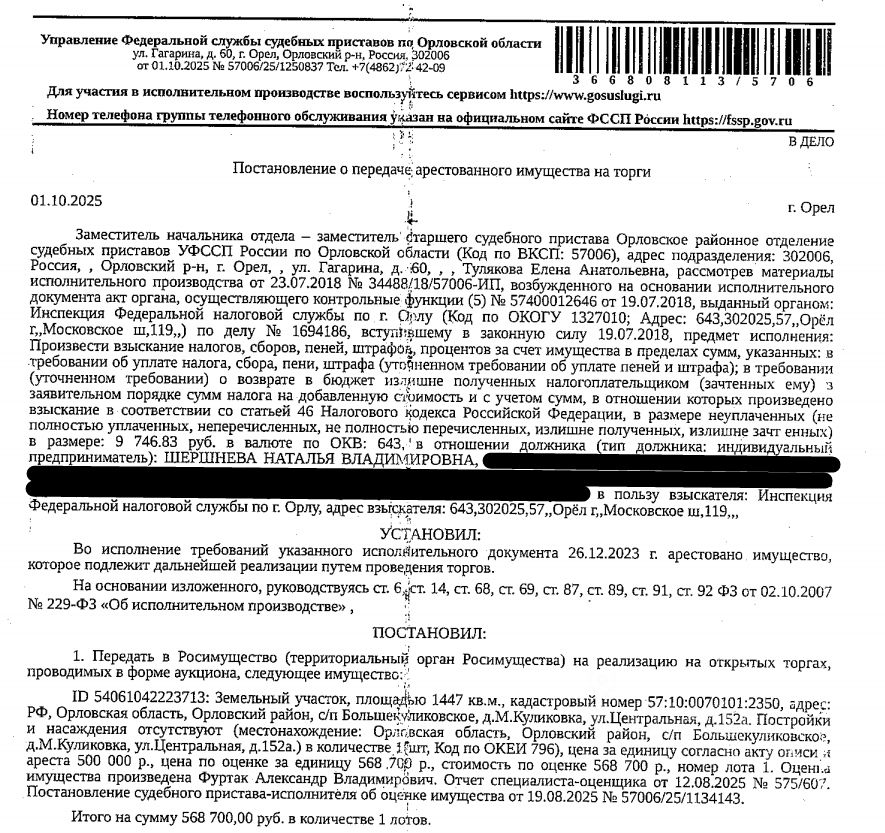 Земельный участок, категория земель: земли населенных пунктов, виды разрешенного использования: для ведения личного подсобного хозяйства, площадь: 1447 +/- 13 кв.м, кадастровый номер: 57:10:0070101:2350, местоположение: Местоположение установлено относительно ориентира, расположенного в границах участка. Почтовый адрес ориентира: Российская Федерация, Орловская область, р-н Орловский, с/п Большекуликовское, д Малая Куликовка, ул Центральная, д 152а. Постройки и насаждения отсутствуют. Взыскатель: ИФНС по г. Орлу. Начальная цена 568 700 (Пятьсот шестьдесят восемь тысяч семьсот) руб. 00 коп., без НДС, сумма задатка 280 000 (Двести восемьдесят тысяч) руб. 00 коп. Шаг аукциона 1%: 5 687 (Пять тысяч шестьсот восемьдесят семь) руб. 00 коп.