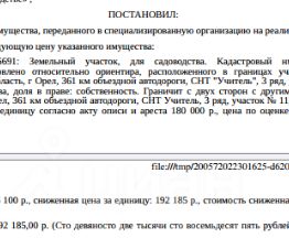 Земельный участок, категория земель: земли населенных пунктов, виды разрешенного использования: для садоводства, площадь: 608 +/-9 кв.м, кадастровый номер: 57:25:0040427:151, местоположение установлено относительно ориентира, расположенного в границах участка. Почтовый адрес ориентира: Орловская область, г Орел, 361 км объездной автодороги, СНТ "Учитель", 3 ряд, участок 11. Согласно выписке ЕГРН от 25.02.2025 г. имеются сведения об оспаривании прав в судебном порядке, см. извещение. Взыскатель: УФНС по Орловской области. Начальная цена 192 185 (Сто девяносто две тысячи сто восемьдесят пять) руб. 00 коп., без НДС, сумма задатка 90 000 (Девяносто тысяч) руб. 00 коп. Шаг аукциона 1%: 1 921 (Одна тысяча девятьсот двадцать один) руб. 85 коп.