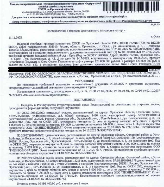 Жилой дом, площадь 132,8 кв.м., кадастровый номер: 57:10:1930101:178, Здание, нежилое, наименование: летняя кухня, площадь 35 кв.м., кадастровый номер: 57:10:1930101:179. Земельный участок, категория земель: земли населенных пунктов, виды разрешенного использования: для строительства жилого дома, площадь 1496 кв.м., кадастровый номер 57:10:1930101:34,местоположение установлено относительно ориентира, расположенного в границах участка. Почтовый адрес ориентира: Российская Федерация, Орловская область, р-н Орловский, д Усть-Рыбница, ул Воскресенская, д 8. Ограничения-см.извещение. Взыскатель: УФК по Орловской области (Следственное управление следственного комитета РФ по Орловской области). Начальная цена 10 498 400 (Десять миллионов четыреста девяносто восемь тысяч четыреста) руб. 00 коп., без НДС, сумма задатка 5 200 000 (Пять миллионов двести тысяч) руб. 00 коп. Шаг аукциона 1%: 104 984 (Сто четыре тысячи девятьсот восемьдесят четыре) руб. 00 коп.