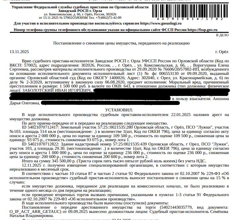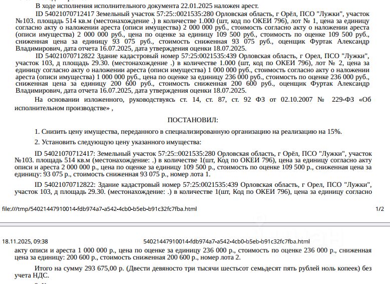 • Здание, назначение: жилое, наименование: жилое строение без права регистрации проживания, расположенное на садовом земельном участке, площадь 29,3 кв.м., кадастровый номер 57:25:0021535:439, местоположение: Орловская область, г Орел, ПСО "Лужки", участок 103, д б/н. • Земельный участок, категория земель: земли населенных пунктов, виды разрешенного использования: для садоводства, площадь 514 +/- 8 кв.м., кадастровый номер 57:25:0021535:280, Местоположение установлено относительно ориентира, расположенного в границах участка. Почтовый адрес ориентира: Орловская область, г Орёл, ПСО "Лужки", участок 103. Взыскатель: Анохина Д.О. Начальная цена 293 675 (Двести девяносто три тысячи шестьсот семьдесят пять) руб. 00 коп., без НДС, сумма задатка 140 000 (Сто сорок тысяч) руб. 00 коп. Шаг аукциона 1%: 2 936 (Две тысячи девятьсот тридцать шесть) руб. 75 коп.