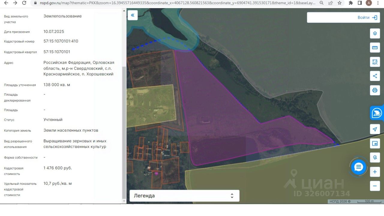 Земельный участок с кадастровым номером 57:15:1070101:410, площадью 138 000 кв.м., расположенный по адресу: Российская Федерация, Орловская область, м.р-н Свердловский, с.п. Красноармейское, п. Хорошевский, категория земель: Земли населенных пунктов, разрешенное использование участка: Выращивание зерновых и иных сельскохозяйственных культур.