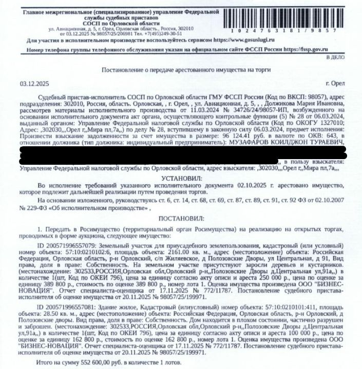 Здание, жилое, жилой дом, кадастровый номер 57:10:0210101:411, площадь: 28,5 кв.м., местоположение: Орловская обл, р-н Орловский, д Полозовские дворы. Сведениями о зарегистрированных по данному адресу лицах Организатор торгов не располагает. Дом в плохом состоянии, частично разрушен и заброшен. Земельный участок, категория земель: земли населенных пунктов, ВРИ: для приусадебного землепользования, кадастровый номер: 57:10:0210102:6, площадь: 2161 +/- 13 кв.м., местоположение: Орловская обл, р-н Орловский, с/п Жиляевское, д Полозовские Дворы, ул Центральная, д 91. Для данного З/У обеспечен доступ посредством земельных участков с кадастровыми номерами: земли общего пользования. На участке присутствуют заросли деревьев и кустарников. Взыскатель: УФНС по Орловской обл. Начальная цена 552 600 (Пятьсот пятьдесят две тысячи шестьсот) руб. 00 коп., без НДС, сумма задатка 260 000 (Двести шестьдесят тысяч) руб. 00 коп. Шаг аукциона 1%: 5 526 (Пять тысяч пятьсот двадцать шесть) руб. 00 коп.
