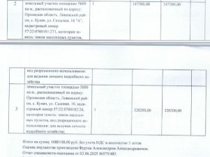Земельный участок, категория земель: земли населенных пунктов, виды разрешенного использования: для ведения личного подсобного хозяйства, кадастровый номер 57:22:0760102:26, площадь 5000 +/- 25 кв.м., местоположение установлено относительно ориентира, расположенного в границах участка. Почтовый адрес ориентира: Российская Федерация, Орловская область, р-н Ливенский, с Кунач, ул Садовая, 10. Взыскатель: Дорохина Ю.С. Начальная цена: 320 200 (Триста двадцать тысяч двести) руб. 00 коп., без НДС, сумма задатка: 150 000 (Сто пятьдесят тысяч) руб. 00 коп. Шаг аукциона 1%: 3 202 (Три тысячи двести два) руб. 00 коп.