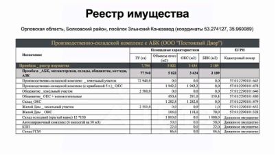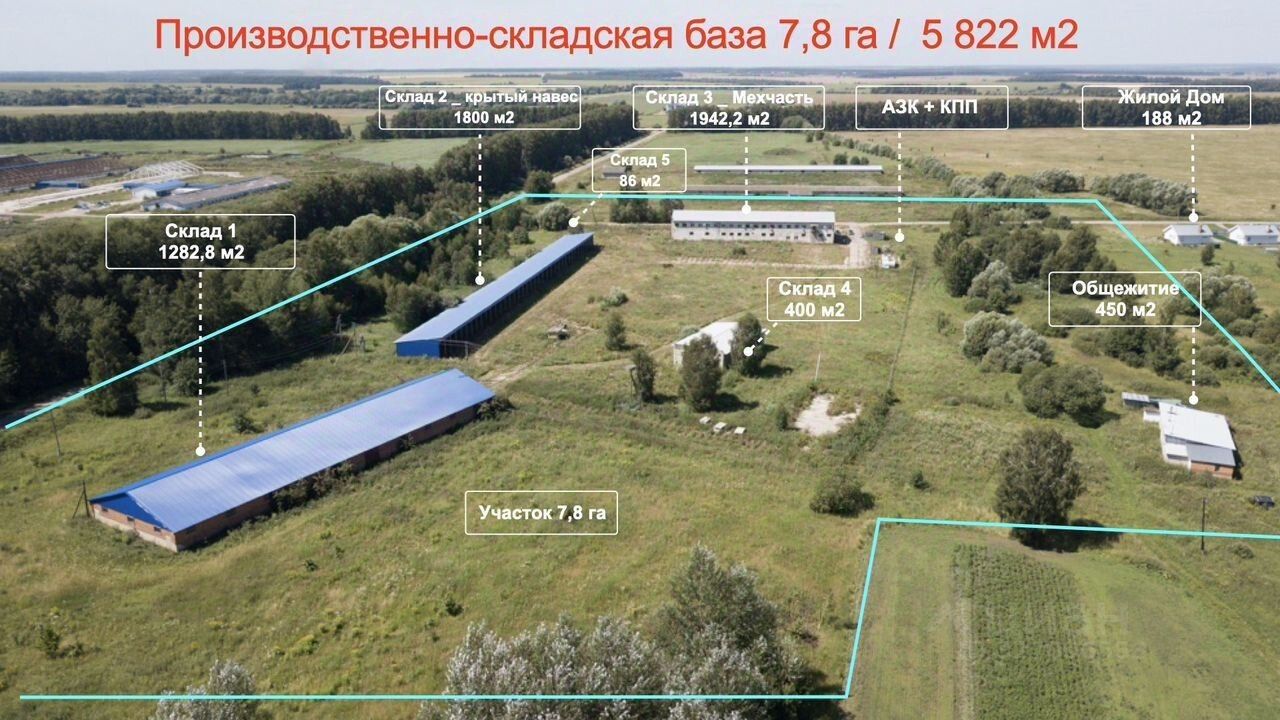 Включает в себя четыре пpoизвoдственно-cкладcких кoрпуca (холодные и теплые склады), административно-бытовую часть с офисами, мастерскими участками, комнатой приема пищи, душевой и хостелом для размещения персонала, мех мастерская, Kпп, Aзк (6 емкостей на 50 м3), кран балка на 5 тонн, парковка для фур и сельхозтехники, открытые бетонные площадки, навесы высотой 7 м для хранения и ремонта техники, складирования строительных материалов, зерна, сена, соломы.