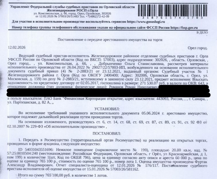 Помещение, назначение: нежилое, наименование: помещение: хоз.место 36, кадастровый номер 57:25:0010504:240, площадь 20,8 кв.м., местоположение: Российская Федерация, Орловская область, г Орёл, ул Красноармейская, д 1, пом 199. Взыскатель: ПАО Банк "Финансовая корпорация "Открытие". Начальная цена: 765 100 (Семьсот шестьдесят пять тысяч сто) руб. 00 коп., без НДС, сумма задатка: 380 000 (Триста восемьдесят тысяч) руб. 00 коп. Шаг аукциона 1%: 7 651 (Семь тысяч шестьсот пятьдесят один) руб. 00 коп.