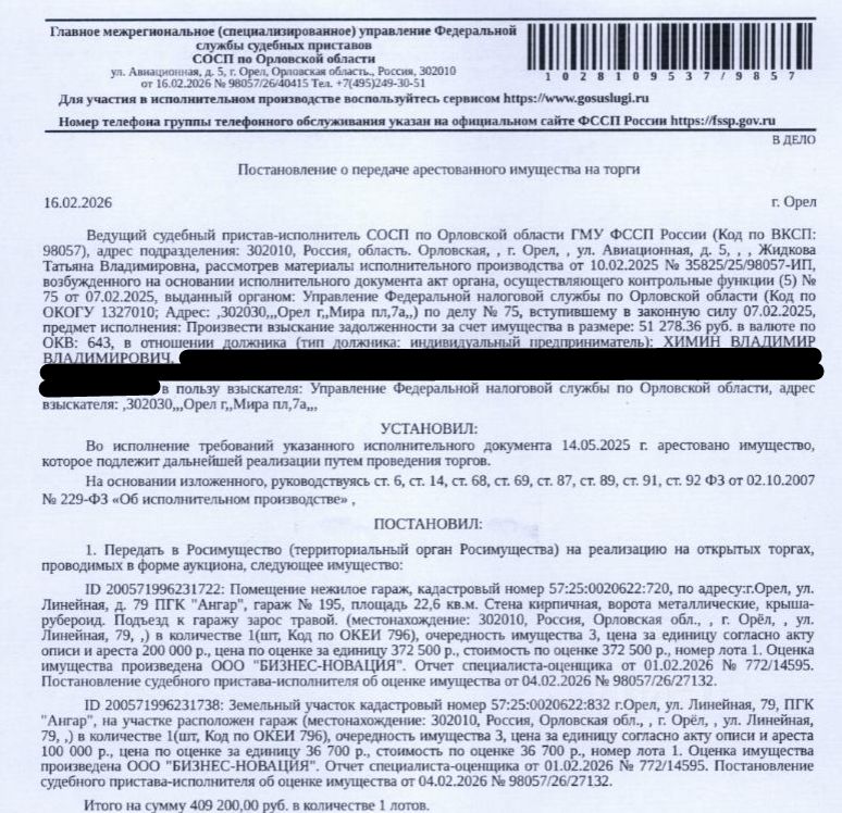Помещение, назначение: нежилое, наименование: помещение: гараж, кадастровый номер 57:25:0020622:720, площадь 22,6 кв.м., местоположение: Орловская область, г Орёл, ул Линейная, д 79, ПГК "Ангар", гараж 195. Стена кирпичная, ворота металлические, крыша-рубероид. Подъезд к гаражу зарос травой. Взыскатель: УФНС по Орловской области. Начальная цена: 372 500 (Триста семьдесят две тысячи пятьсот) руб. 00 коп., без НДС, сумма задатка: 180 000 (Сто восемьдесят тысяч) руб. 00 коп. Шаг аукциона 1%: 3 725 (Три тысячи семьсот двадцать пять) руб. 00 коп.