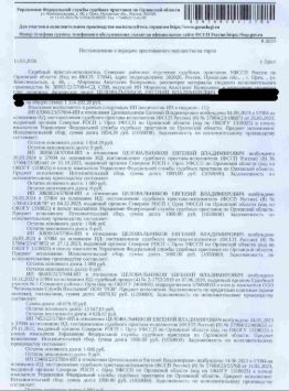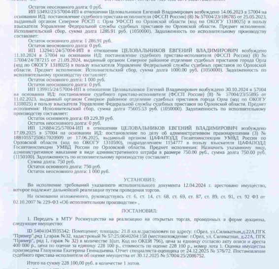 Помещение, назначение: нежилое, наименование: помещение: гараж 32, площадь 21,8 кв.м., кадастровый номер 57:25:0040204:158, местоположение: Орловская область, г Орёл, ул Силикатная, д 22а, ПГК "Пример", ряд 1, гараж 32. Взыскатель: УФССП по Орловской обл., ООО "Региональная служба взыскания" и др. Начальная цена: 228 100 (Двести двадцать восемь тысяч сто) руб. 00 коп., без НДС, сумма задатка: 110 000 (Сто десять тысяч) руб. 00 коп. Шаг аукциона 1%: 2 281 (Две тысячи двести восемьдесят один) руб. 00 коп.