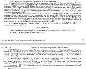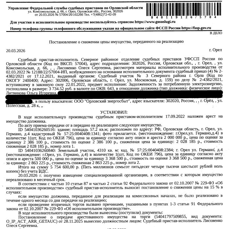 Здание, назначение: жилой дом, наименование: жилой дом, кадастровый номер 57:25:0040408:1341, площадь 57,2 кв.м, местоположение: Орловская обл, г Орёл, ул Германо, д 4. Сведениями о зарегистрированных по данному адресу лицах Организатор торгов не располагает; Земельный участок, категория земель: земли населенных пунктов, ВРИ: эксплуатация и обслуживание жилого дома, для строительства жилого дома, кадастровый номер 57:25:0040408:2384, площадь 4310 +/- 18 кв.м, местоположение: Орловская обл, г Орёл, ул Германо, д 4.Для данного з/у обеспечен доступ посредством земель общего пользования. Ограничения прав на земельный участок, предусмотренные ст. 56 ЗК РФ. Взыскатель: ООО "Орловский энергосбыт". Начальная цена 4 891 410 (Четыре миллиона восемьсот девяносто одна тысяча четыреста десять) руб. 00 коп., без НДС, сумма задатка 2 400 000 (Два миллиона четыреста тысяч) руб. 00 коп. Шаг аукциона 1%: 48 914 (Сорок восемь тысяч девятьсот четырнадцать) руб. 10 коп.