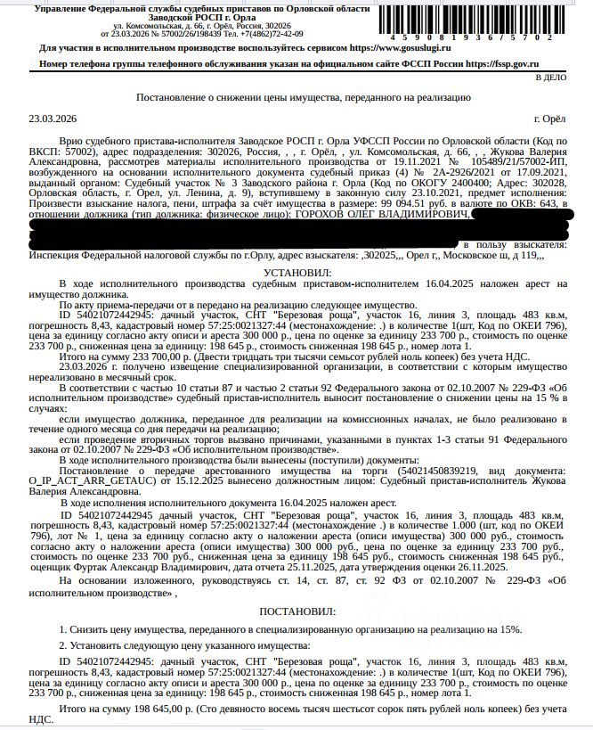 Земельный участок, категория земель: земли населенных пунктов, виды разрешенного использования: для дачного участка, кадастровый номер 57:25:0021327:44, площадь 483 +/- 8,43 кв.м, местоположение установлено относительно ориентира, расположенного в границах участка. Почтовый адрес ориентира: Орловская область, г Орёл, СНТ "Березовая роща", участок 16, линия 3. На земельном участке находится подсобное помещение размером 1,5 на 1,5 м из белого кирпича, крыша из шифера. Также находится строение на фундаменте, размером 5 на 2 м, из белого кирпича. Взыскатель: ИФНС по г. Орлу. Начальная цена 198 645 (Сто девяносто восемь тысяч шестьсот сорок пять) руб. 00 коп., без НДС, сумма задатка 90 000 (Девяносто тысяч) руб. 00 коп. Шаг аукциона 1%: 1 986 (Одна тысяча девятьсот восемьдесят шесть) руб. 45 коп.