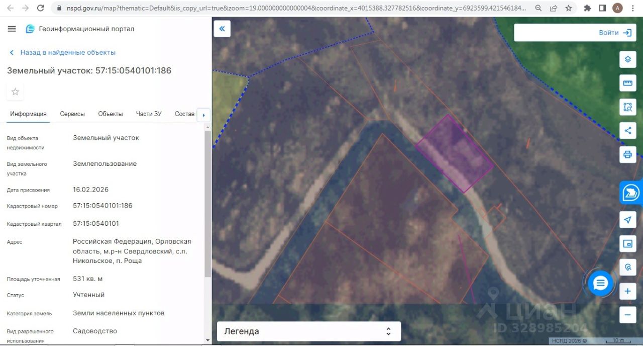 Земельный участок с кадастровым номером 57:15:0540101:186, площадью 531 кв.м., расположенный по адресу: Российская Федерация, Орловская область, м.р-н Свердловский, с.п. Никольское, п. Роща, категория земель: Земли населенных пунктов, разрешенное использование участка: Садоводство.