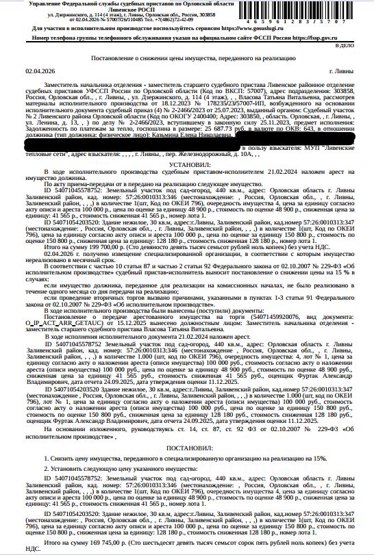 Здание, нежилое, наименование: дом, кадастровый номер 57:26:0010313:347, площадь 30 кв.м., местоположение: Орловская обл, г Ливны, Заливенский район. Земельный участок, категория земель: земли населенных пунктов, виды разрешенного использования: под сад-огород, кадастровый номер 57:26:0010313:346, площадь 440 кв.м., местоположение: Орловская обл, г Ливны, Заливенский район. Особые отметки: Граница земельного участка не установлена в соответствии с требованиями земельного законодательства. СМ. ИЗВЕЩЕНИЕ. Взыскатель: МУП "Ливенские тепловые сети". Начальная цена: 169 745 (Сто шестьдесят девять тысяч семьсот сорок пять) руб. 00 коп., без НДС, сумма задатка: 80 000 (Восемьдесят тысяч) руб. 00 коп. Шаг аукциона 1%: 1 697 (Одна тысяча шестьсот девяносто семь) руб. 45 коп.
