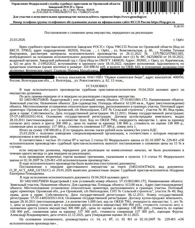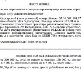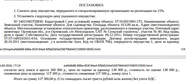 Земельный участок, категория земель: земли сельскохозяйственного назначения, виды разрешенного использования: для садоводства, кадастровый номер 57:10:0021801:172, площадь 613 +/- 9 кв.м., местоположение установлено относительно ориентира, расположенного в границах участка. Почтовый адрес ориентира: Орловская обл, р-н Орловский, с/п Неполодское, СНТ "Сельский строитель", участок 40. Взыскатель: НАО ПКО "Первое клиентское бюро". Начальная цена: 117 300 (Сто семнадцать тысяч триста) руб. 00 коп., без НДС, сумма задатка: 50 000 (Пятьдесят тысяч) руб. 00 коп. Шаг аукциона 1%: 1 173 (Одна тысяча сто семьдесят три) руб. 00 коп.