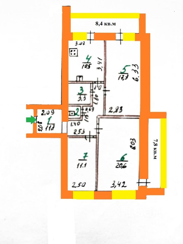 Общая площадь квартиры 76,4 кв.м; жилая -49,6 кв.м; кухня 10,5 кв.м плюс две лоджии (7,8 кв.м +8,4 кв.м).