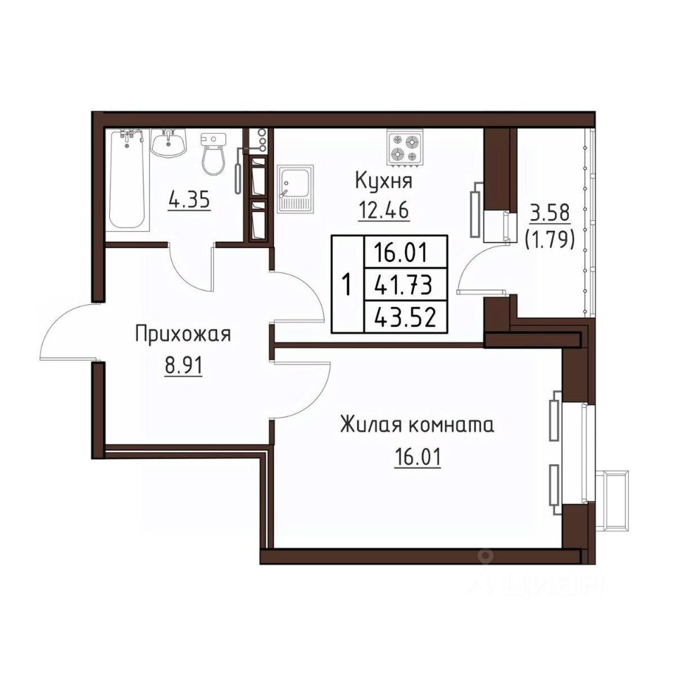 1-комн. квартира, 43,52 м²