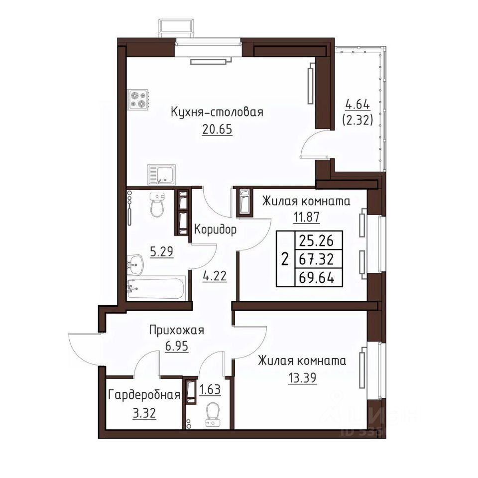 2-комн. квартира, 69,64 м²