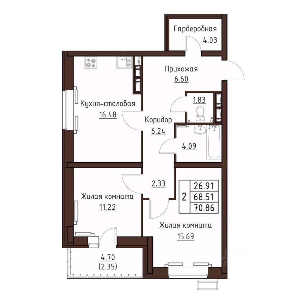 2-комн. квартира, 70,86 м²