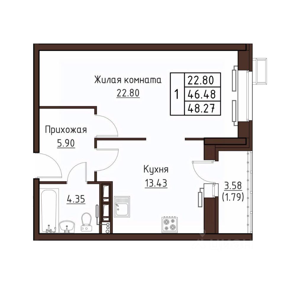 1-комн. квартира, 48,27 м²