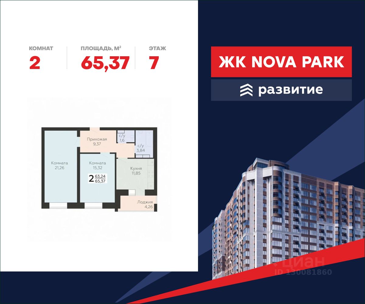 Продается квартира площадью 65.37 кв. м с отделкой white box. Квартира расположена на 7 этаже 17 этажного дома, в жилом комплексе комфорт-класса "Nova парк".