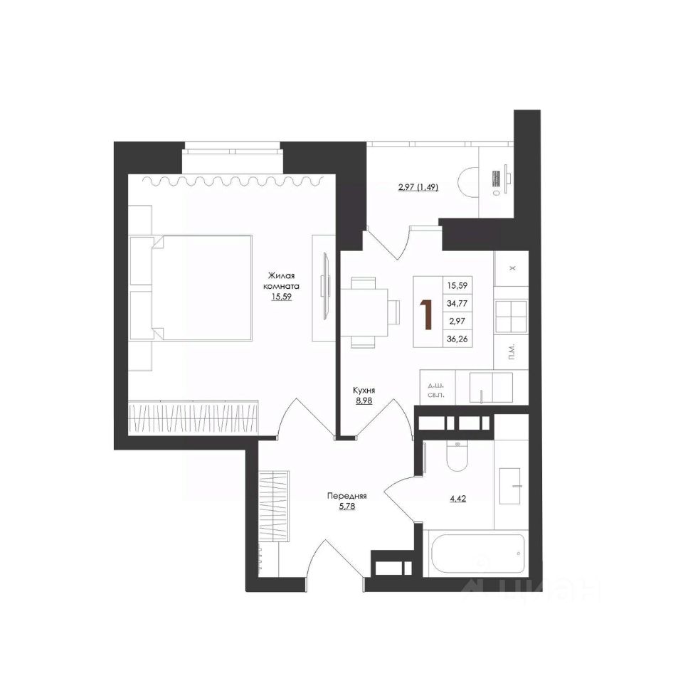 Общая площадь36,26 м²