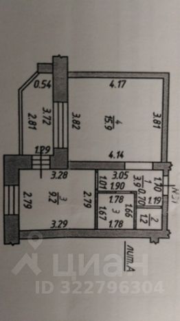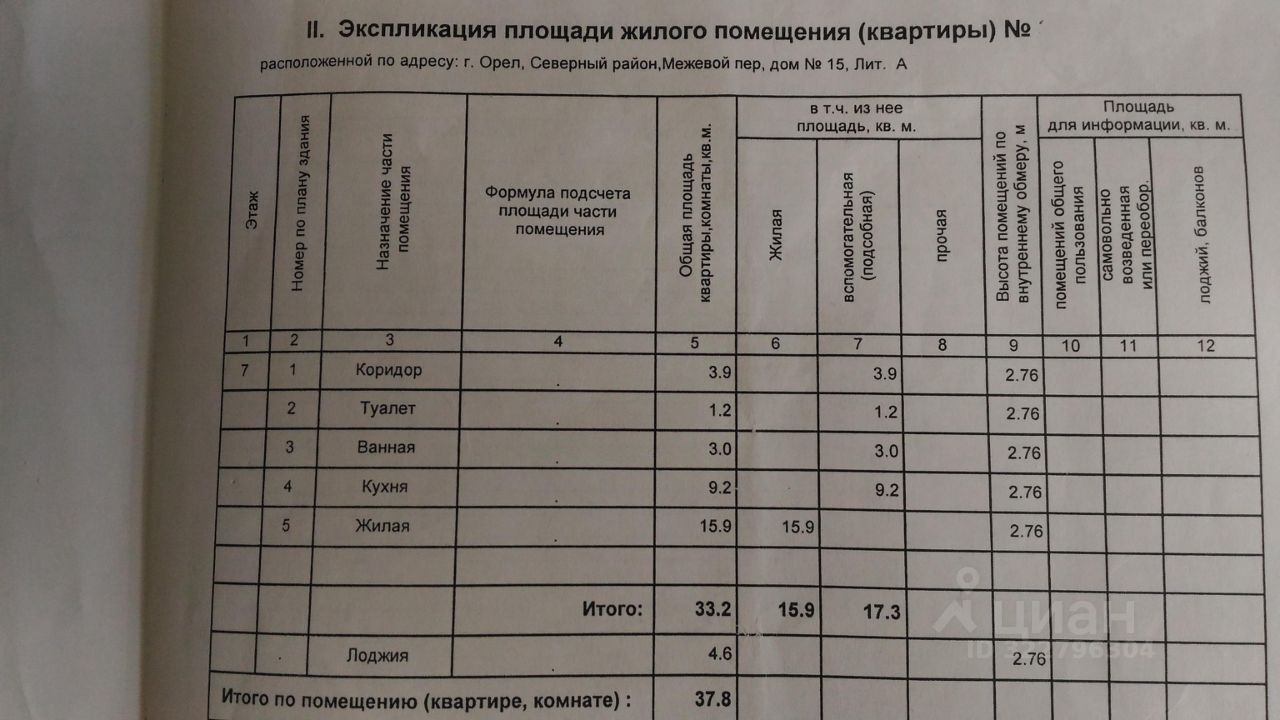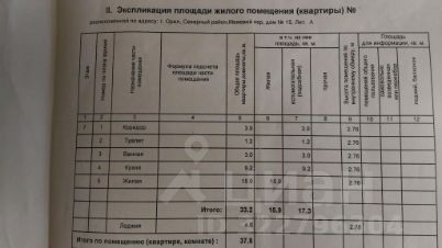 Общая площадь - 37,8 кв.м, жилая - 16 кв.м, кухня- 9,2 кв.м; потолки - 2,75 м; ванная - 3,0 кв.м, туалет - 1,2 кв.м.
