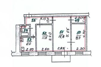 Общая площадь квартиры 54,6 кв.м. Кухня 6 кв.м., гостинная с выходом на балкон - 15,18 кв.м., две спальни 11 кв.м и 9,7 кв.м. Коридор площадью 6,7 кв.м. Совмещенный санузел. Есть кладовая 2,4 кв.м. В квартире все исправное.