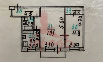 Общая площадь 46,5 кв.м+ 2,2 кв.м балкон, комнаты(19,1+11,8).