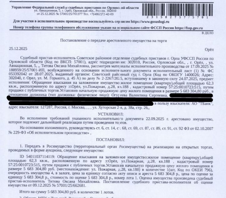 Помещение, назначение: жилое, наименование: квартира, площадь 62,3 кв.м., кадастровый номер 57:25:0010723:515, местоположение: Российская Федерация, Орловская область, г Орёл, ул Пожарная, д 28, кв 188. Согласно ответу ООО "РКЦ-Система Расчетов" ООО "Орелжилэксплуатация" от 09.12.2025 по данному адресу зарегистрировано 3 человека, в том числе 1 несовершеннолетний. Согласно справке НО "РФКР" от 08.12.2025 задолженность по взносам на капитальный ремонт отсутствует. Залогодержатель: АО "ТБанк". Начальная цена: 5 683 304 (Пять миллионов шестьсот восемьдесят три тысячи триста четыре) руб. 80 коп., без НДС, сумма задатка: 280 000 (Двести восемьдесят тысяч) руб. 00 коп. Шаг аукциона 1%: 56 833 (Пятьдесят шесть тысяч восемьсот тридцать три) руб. 05 коп.