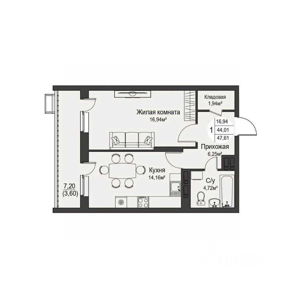 Общая площадь47,61 м²