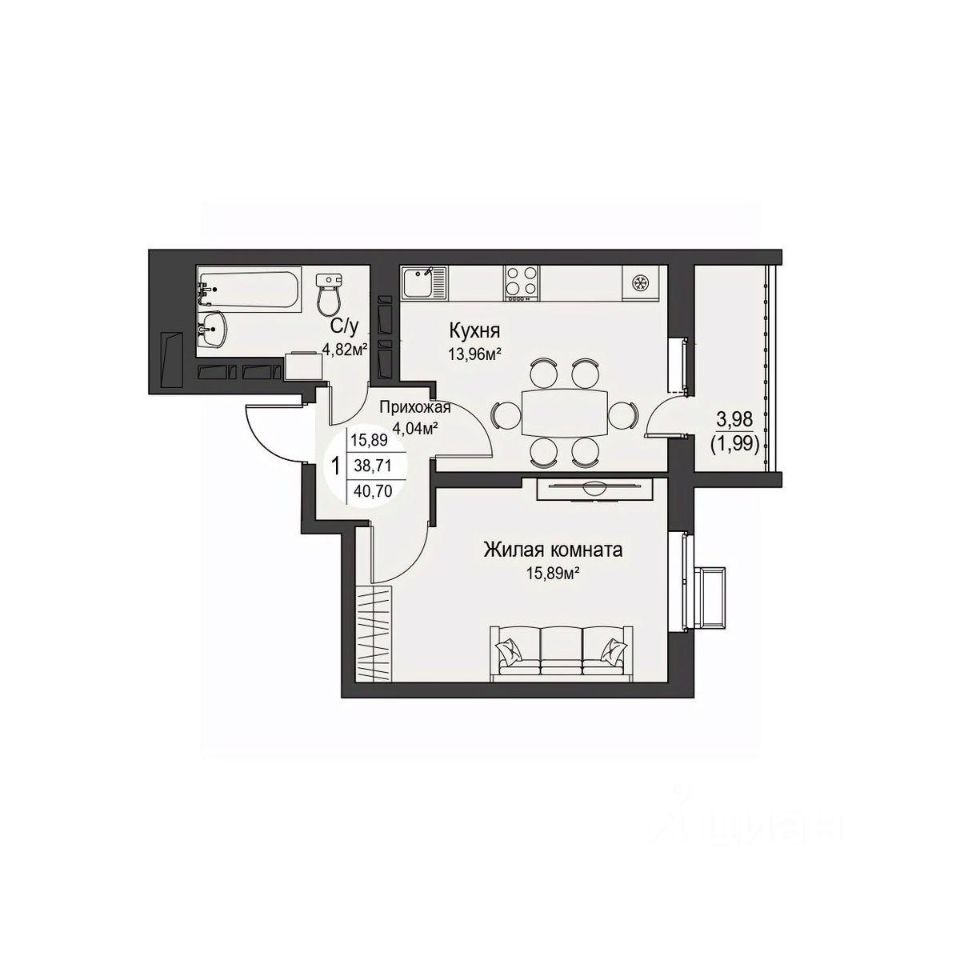 Общая площадь40,7 м²