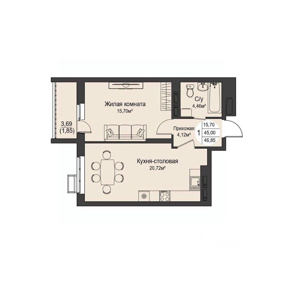 Общая площадь46,85 м²