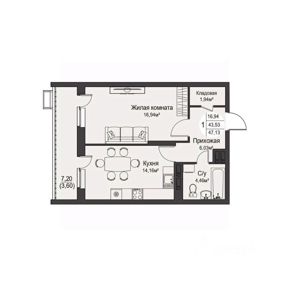 Общая площадь47,13 м²