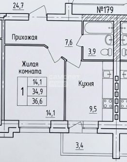 Общая площадь квартиры — 34,9 кв. м (без учёта балкона 3,4 кв. м).