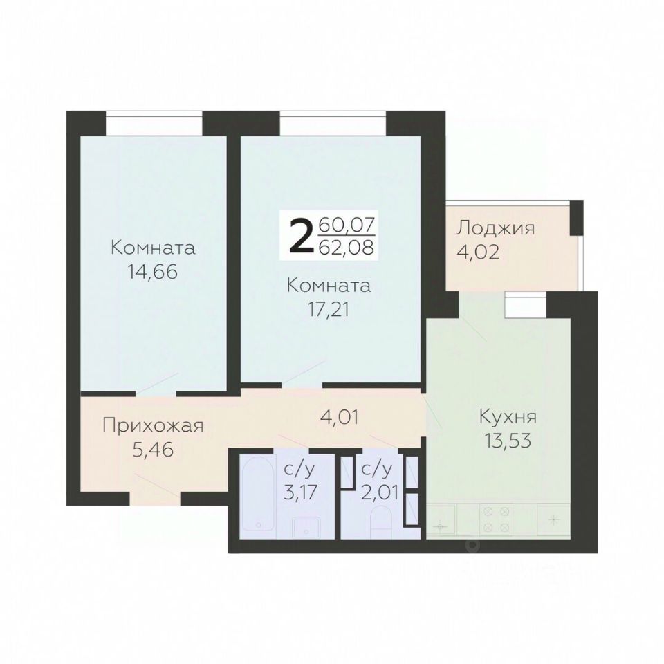 Продается 2-комн. квартира, 62,08 м²