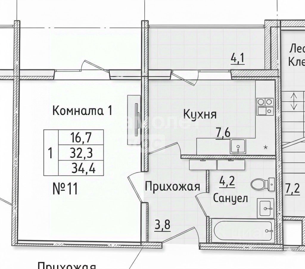 Общая площадь — 32,3 кв.м (34,3 кв.м с лоджией). Комната 16,7 кв.м позволяет комфортно разместить зону отдыха и рабочее пространство. Кухня 7,6 кв.м — практичная и уютная. Прихожая 3,8 кв.м и совмещённый санузел 4,2 кв.м грамотно организованы и не "съедают" полезную площадь.