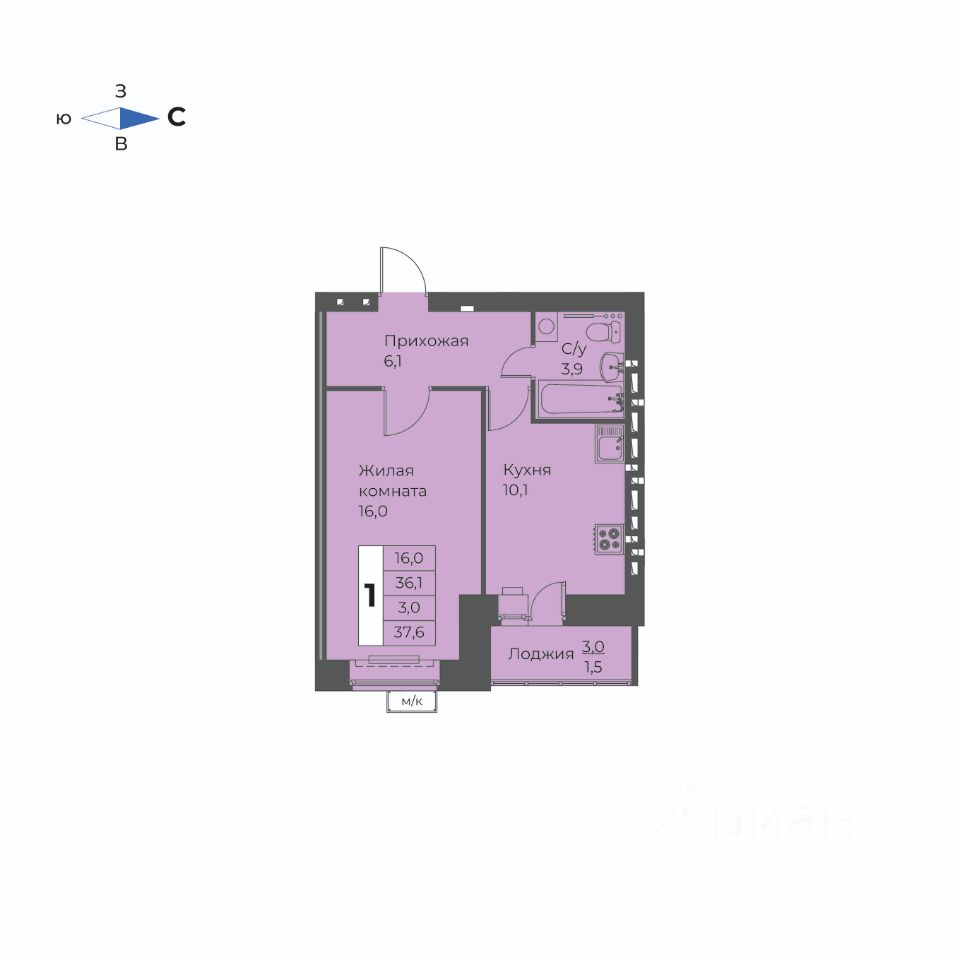 1-комн. квартира, 37,6 м²