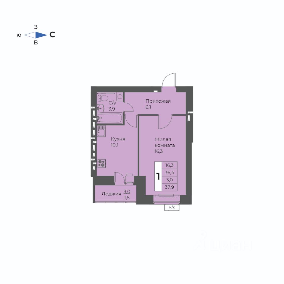 1-комн. квартира, 37,9 м²