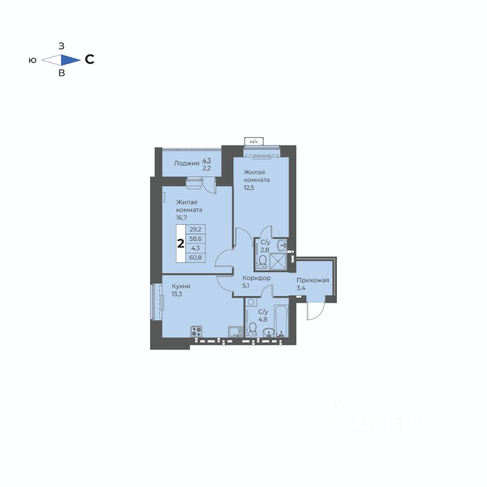 2-комн. квартира, 60,8 м²